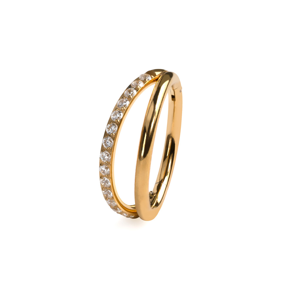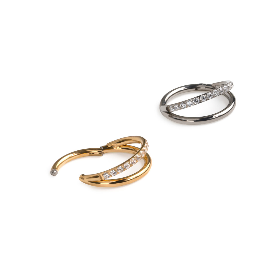 Šis Bodymod Trend titano dvigubas žiedas su akutėmis vienoje juostoje yra gana originalus dėl savo dvigubo dizaino; viena pusė lygi ir minimalistinė, o kita papuošta akutėmis. Dvi nuotaikos, vienas žiedas.