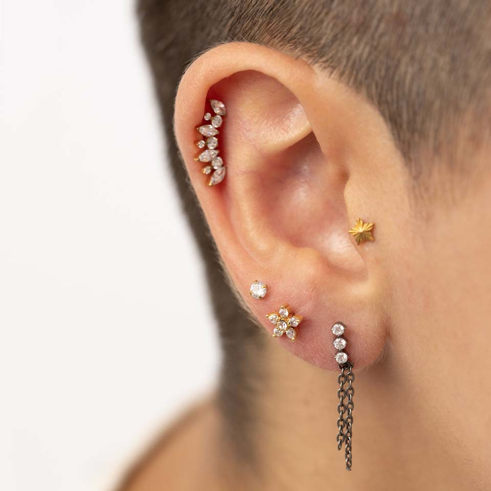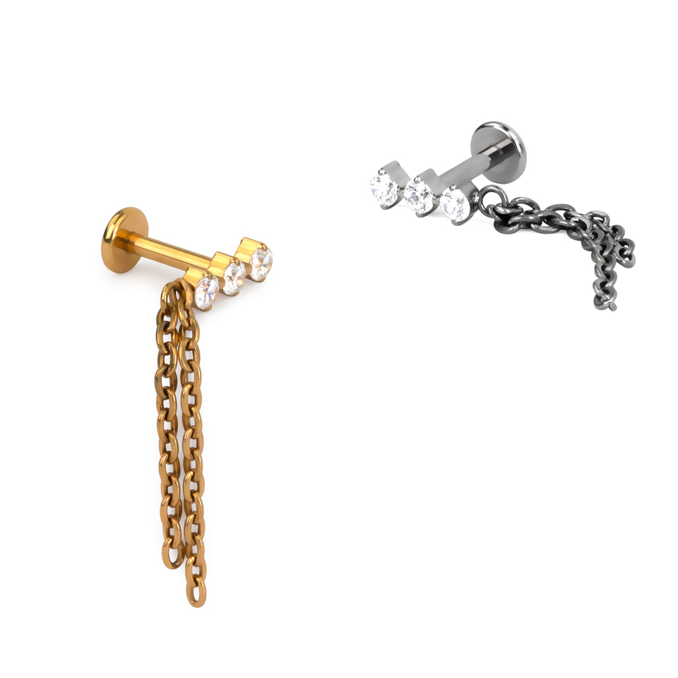 This stylish labret features a row of three bezel set zirconia stones with two chain dangles attached by a tiny loop at one end. The chains are different lengths giving a cool asymetric effect. The longer chain measures 19mm (0.75"). This piece can be worn horizontally in the lobe, or vertically or at an angle in other ear piercings - style it your way to achieve your look.