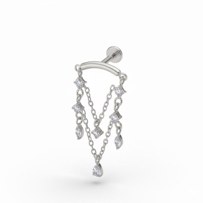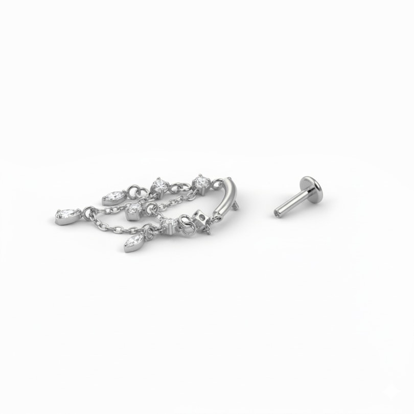 Titano labret su pakabukais orientuotas į judesį. Po labret kaba maži akutėmis papuošti lašeliai, kurie švelniai linguoja jums pasukant galvą. Atrodo šventiškai, tačiau neperdėtai. Puikiai tinka, kai norisi šiek tiek kitokio stiliaus nei jūsų kasdieniai papuošalai. Galima įsigyti aukso ir sidabro spalvų.