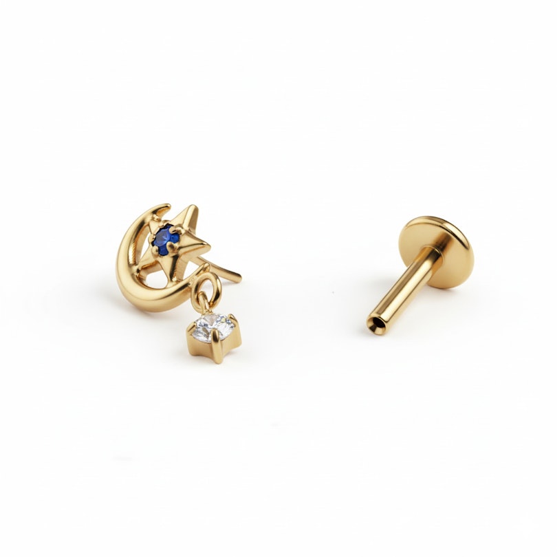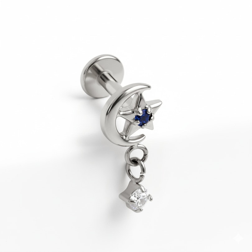 Titano mėnulio ir žvaigždės labret su pakabuku suteikia šiek tiek judesio jūsų įvaizdžiui. Priekyje yra mažas mėnulis ir žvaigždė, prie kurių pakabintas smulkus pakabukas švelniai linguoja judant. Dekoratyvus, bet neperkrautas, puikiai tiks, kai norisi kažko išraiškingesnio. Galima įsigyti aukso ir sidabro spalvų.