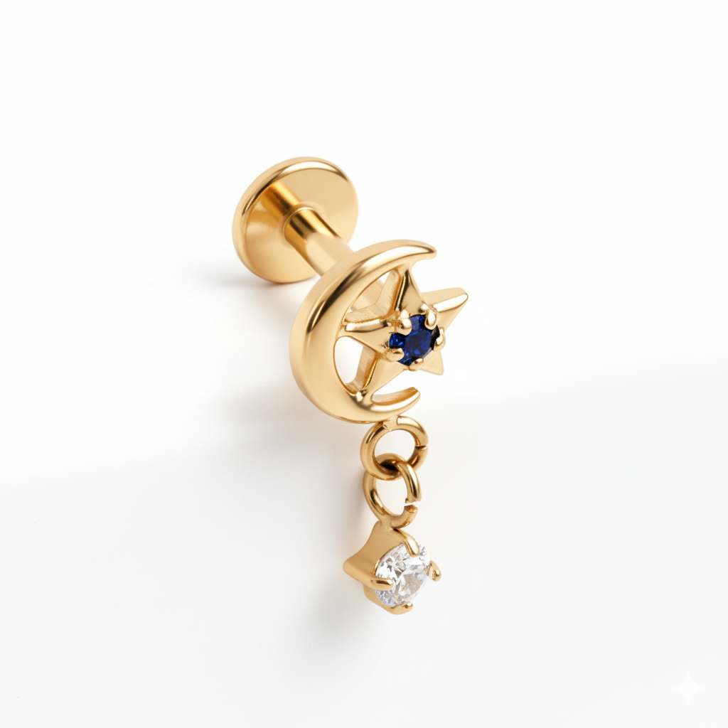 Titano mėnulio ir žvaigždės labret su pakabuku suteikia šiek tiek judesio jūsų įvaizdžiui. Priekyje yra mažas mėnulis ir žvaigždė, prie kurių pakabintas smulkus pakabukas švelniai linguoja judant. Dekoratyvus, bet neperkrautas, puikiai tiks, kai norisi kažko išraiškingesnio. Galima įsigyti aukso ir sidabro spalvų.