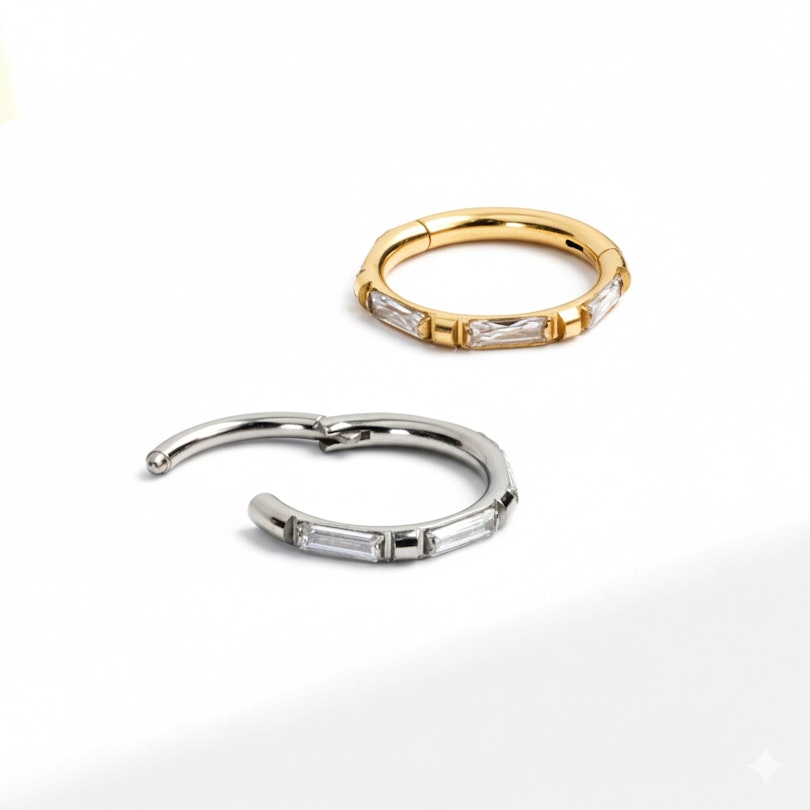 Šis titano žiedinis auskaras su baguette formos akutėmis yra stilingo kintančių baguette formos kvadratinių kubinio cirkonio akučių ir mažų metalinių kvadratėlių žiedinio auskaro išorėje dizaino. Tai žiedinis auskaras su vyriais, tad jį lengva užsegti ir įverti į auskaro vėrimo vietą. Pagamintas iš titano, tad hipoalergiškas, patvarus ir atsparus vandeniui.