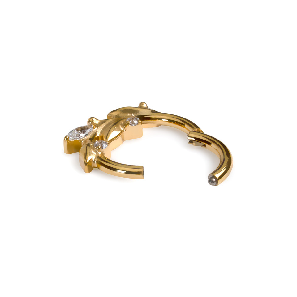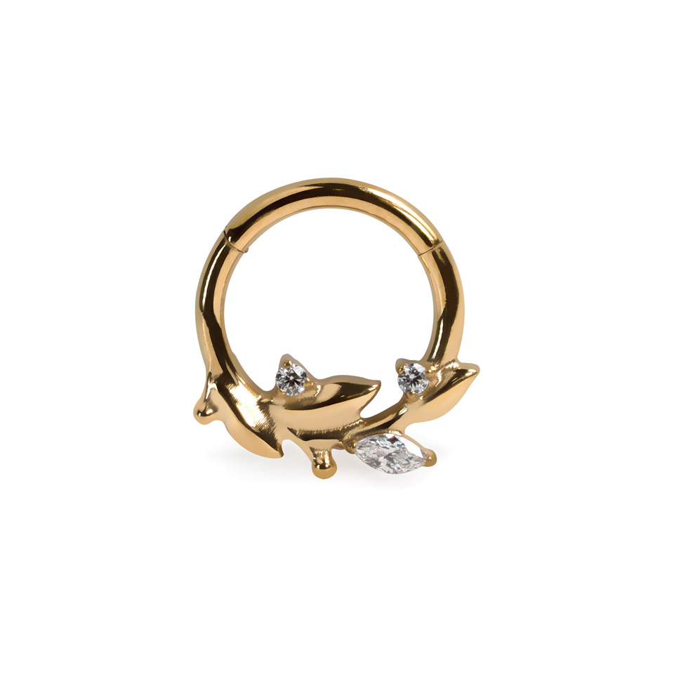 Šis gražus žiedinis auskaras su subtiliais lapeliais pagamintas iš titano, o tai reiškia, kad tinka jautriai odai. Dėl vyrių mechanizmo papuošalą lengva įverti į auskaro vėrimo vietą.