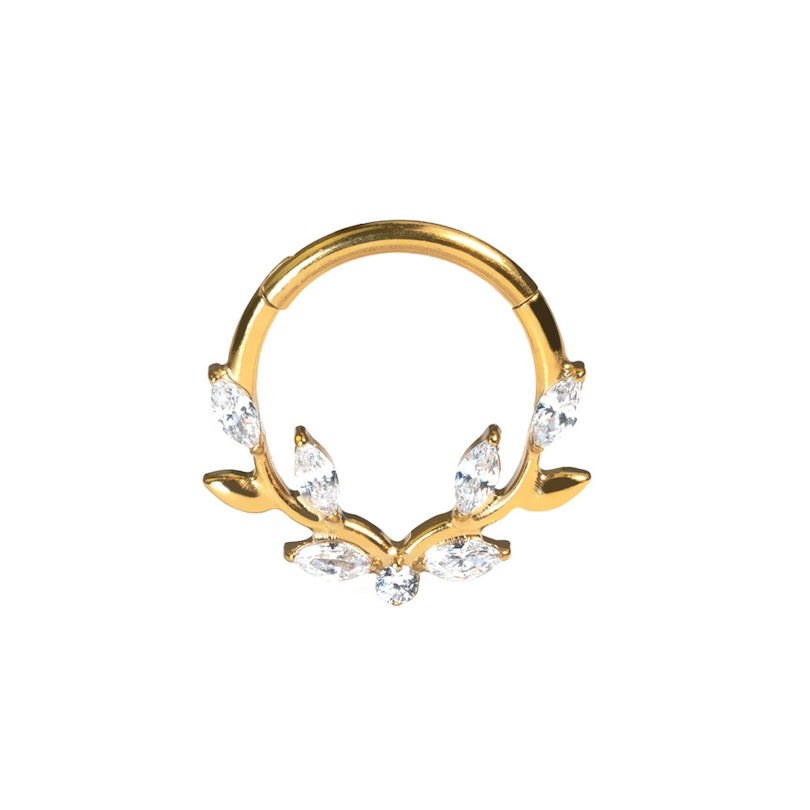 Šis aukščiausios klasės ir gražaus vijoklinio dizaino į priekį nukreiptas užsegamas žiedinis auskaras puikiai atrodys tokiose auskarų vėrimo vietose, kaip daith ir septum. Pagamintas iš titano, todėl patvarus ir hipoalergiškas. Puikus jūsų kolekcijos papildymas.
