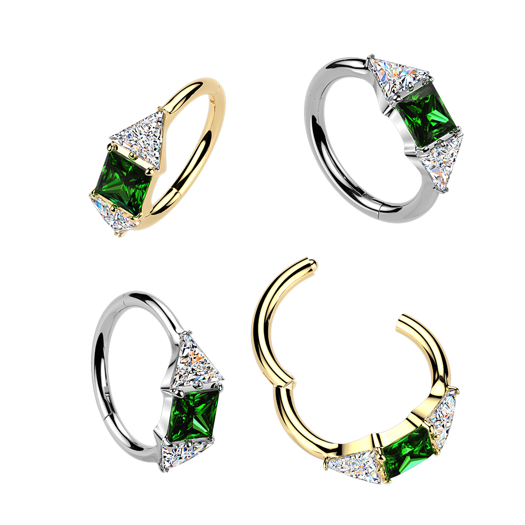 Tai atnaujinimas jūsų auskaro vėrimo vietoms, apie kurį nė negalėjote pagalvoti. Šis Bodymod Premium titano žiedinis auskaras su žaliu akmenėliu per vidurį savo drąsiu papuošimu, įrėmintu dviem aštriais baltais trikampiais akmenėliais, atspindi šviesą iš kiekvieno kampo. Tai šiek tiek spalvinga glotni geometrija.
