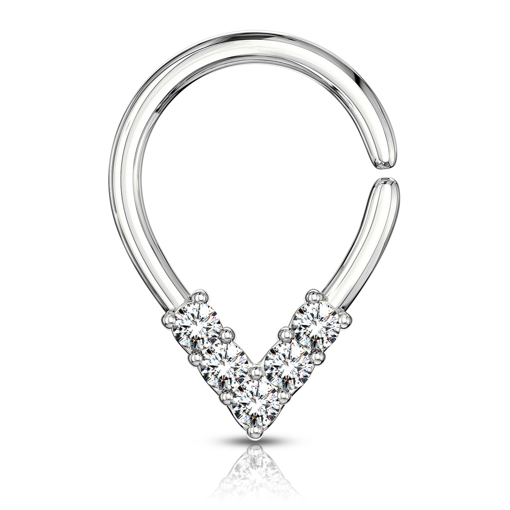 Elegantiškas auskaras papuoštas penkiais skaidriais kristalais. Auskaras prieinamas įvairių dydžių, kad galėtum nešioti šį žiedą bet kur! Toks žiedas dailiai atrodys septume arba tragus pirsinge. Sprendi Tu!