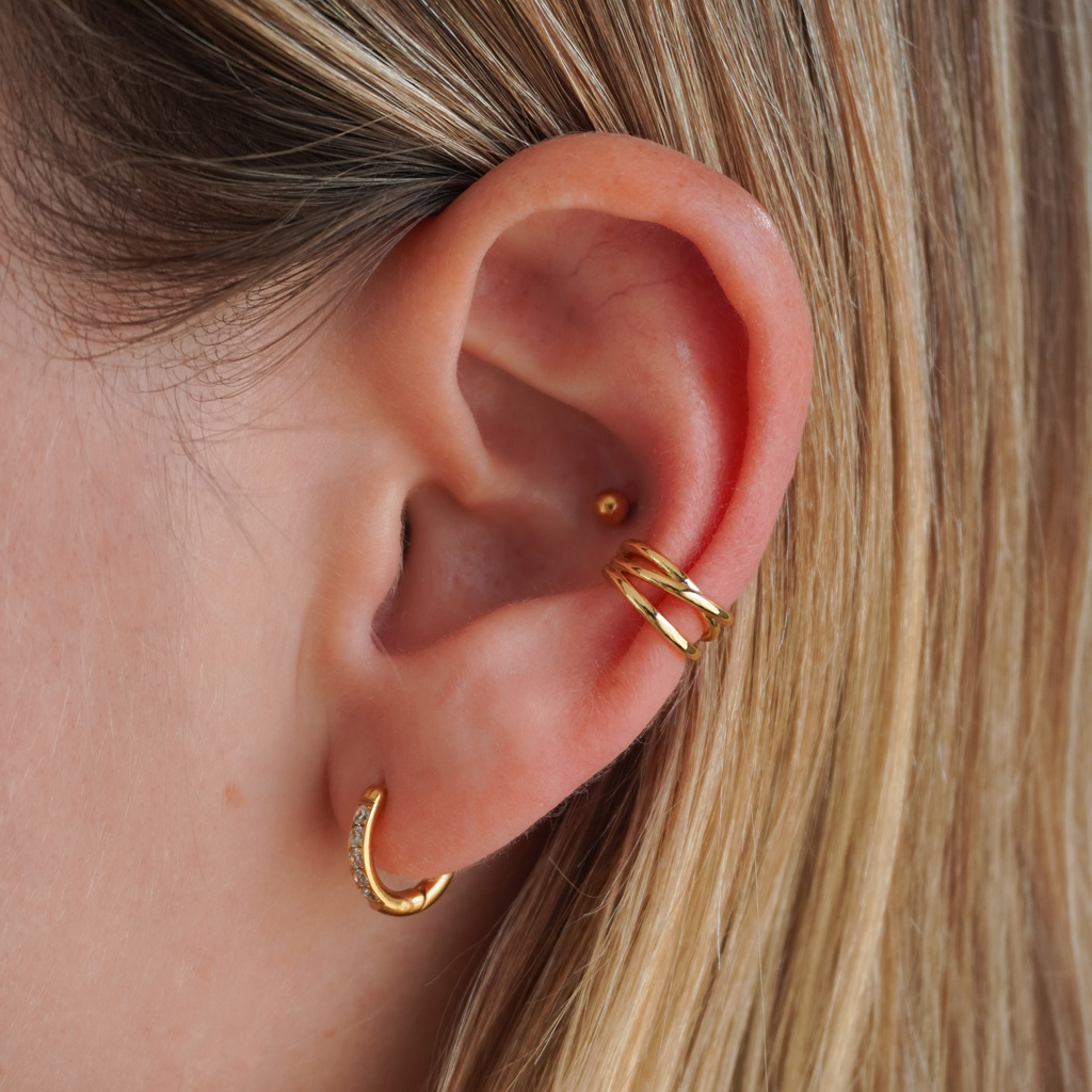 Elegantiškos linijos ir šiek tiek struktūros. Šis trigubas susikryžiuojantis netikras auskaras sujungia tris lankus ir drąsiai bei subalansuotai papildo jūsų įvaizdį.