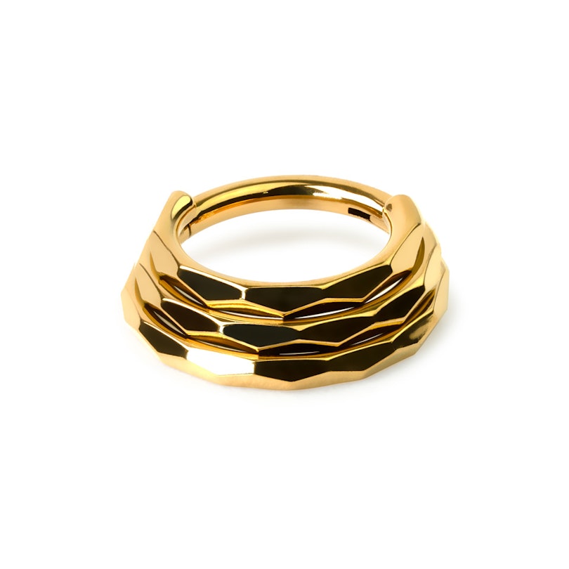 This stylish hinged ring has the look of 3 rings in one. Only the middle ring goes through your piercing. The outside of the rings have a diamond pattern to them which gives a cool textured look to the piece.