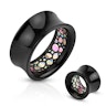 You can now get this beautiful, easy-to-use tunnel made in black acrylic, with the most beautiful inside you can imagine. The saddle shape enables a better fit in your ear gauge, and it's available in different sizes. Choose the gauge size you need from 0g up to 1-inch (8 mm to 25 mm).
