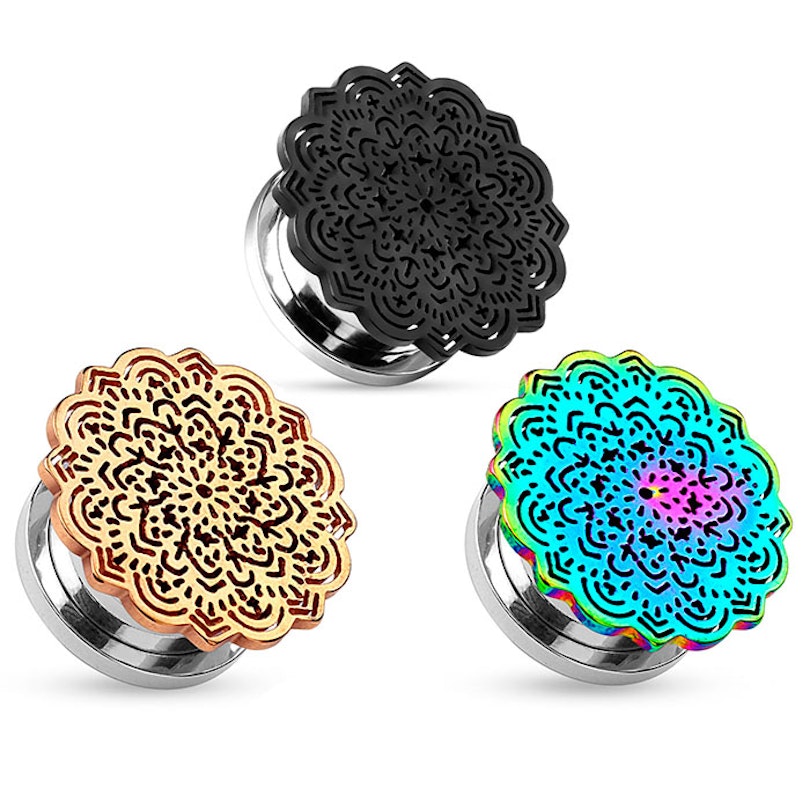 You can choose this beautiful and detailed mandala from different colors, classic or vibrant. When the tunnel is in the earlobe, the mandala is the only visible part. The back is made of surgical steel, which can be unscrewed for easy insertion and removal.