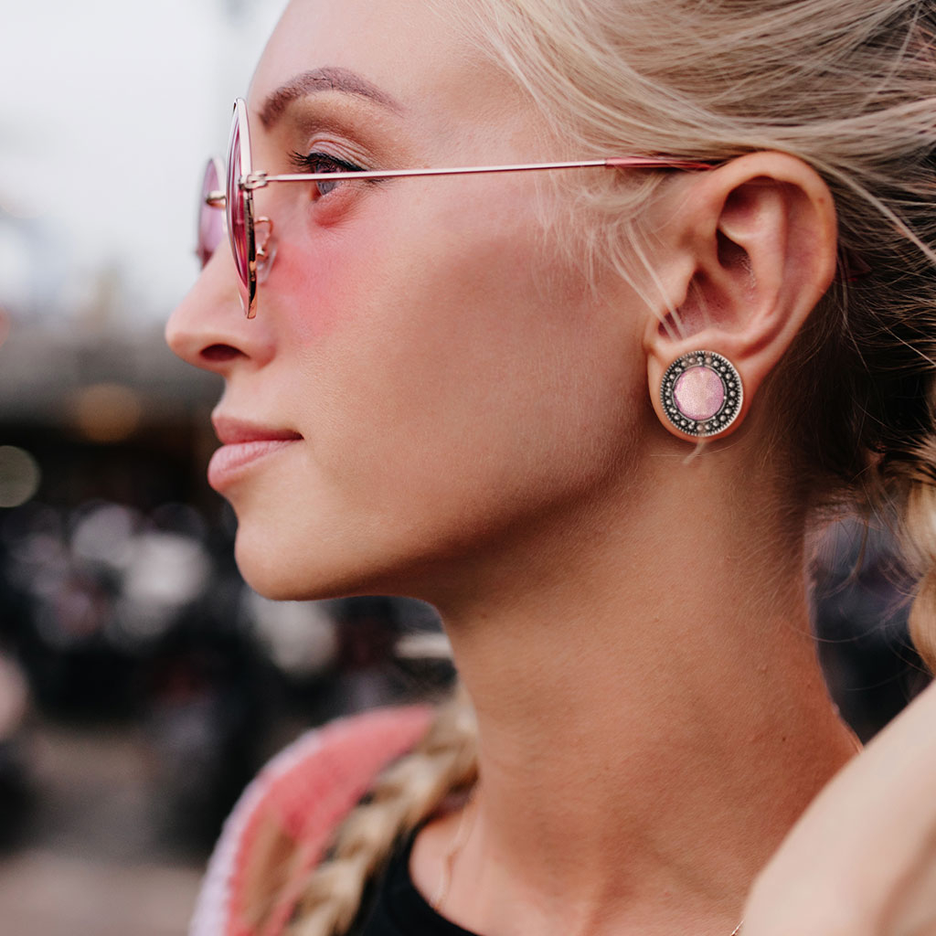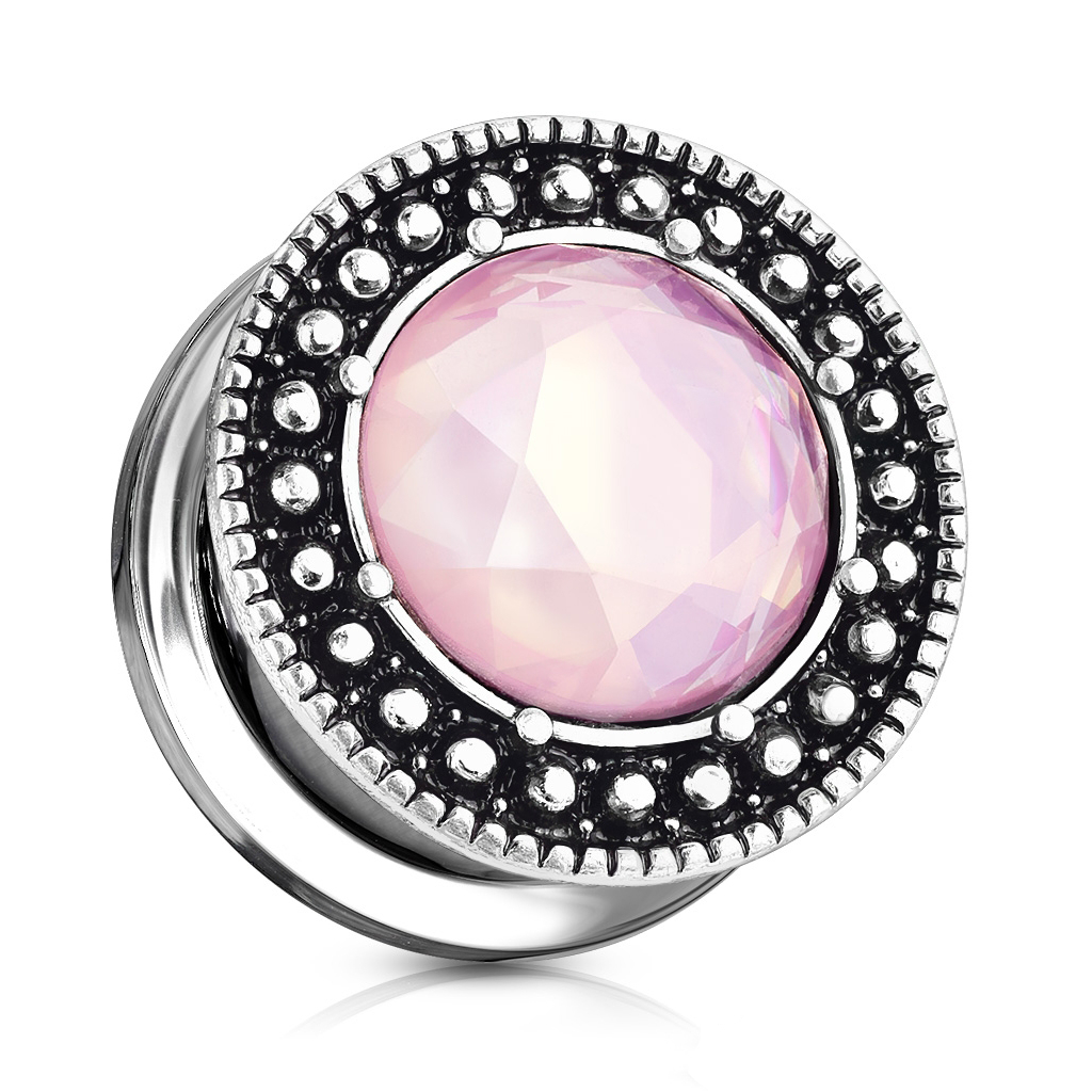 The front side of this plug is coated with antique silver. Hence the dark color that you can see in the picture above, which makes the pink gem stand out. Around it, several little dots provide the piece with depth and enhance the beauty of the plug.