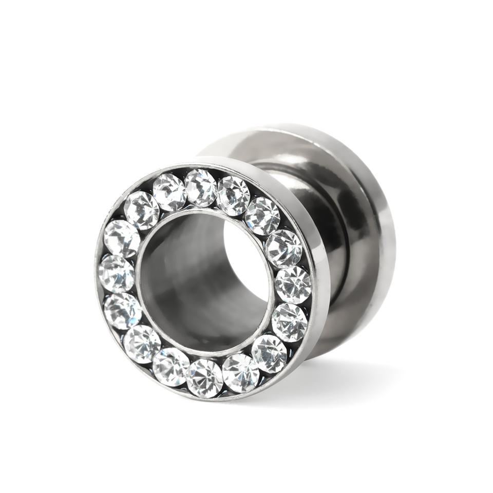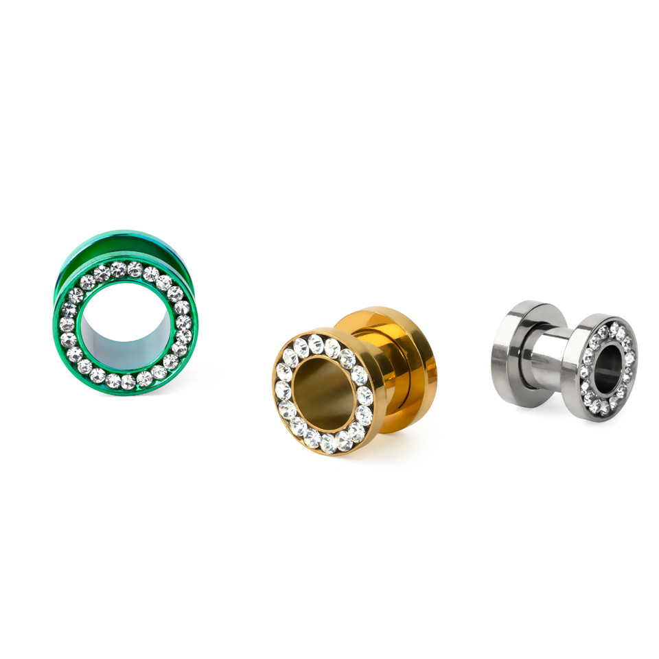 Classic tunnel in surgical steel in your choice of different colors and sizes. All the models have many beautiful stones studded one next to another around the entire edge. The tunnel is available in different gauge sizes that suit almost every earlobe out there.