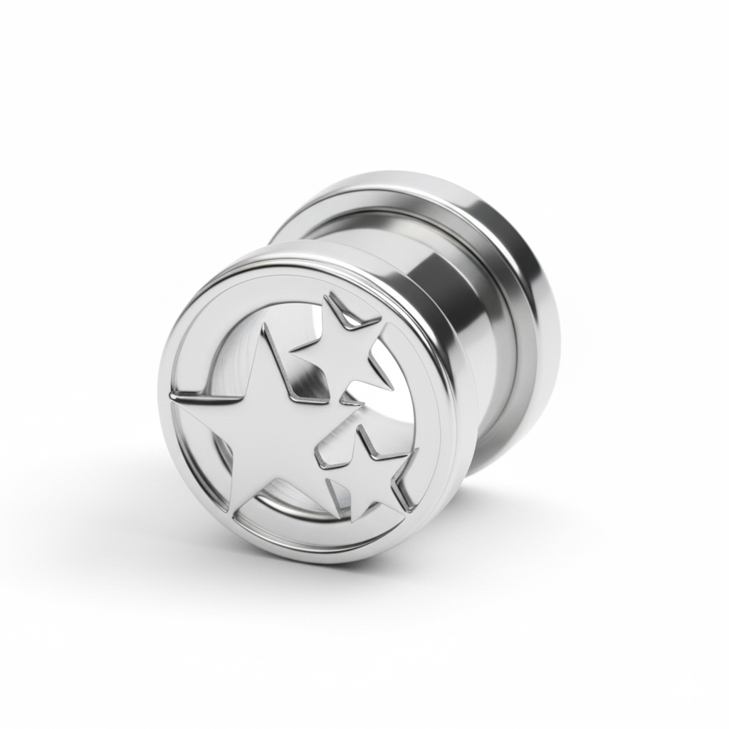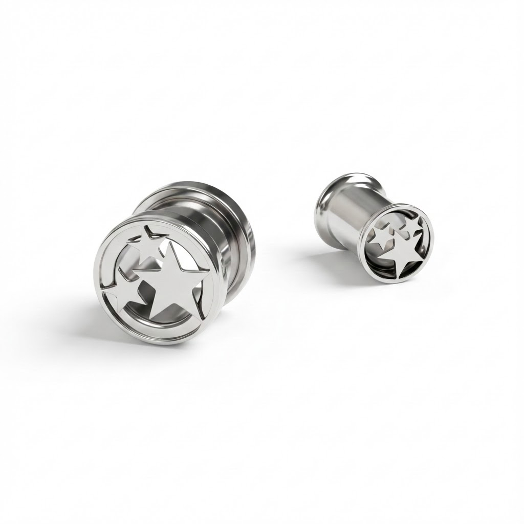 Pagamintas iš chirurginio plieno, tvirtas, atsparus vandeniui ir tinkamas daugumai odos tipų. Išorinis sriegis supaprastina naudojimą: įkiškite tunelį, prisukite galinę dalį ir viskas.