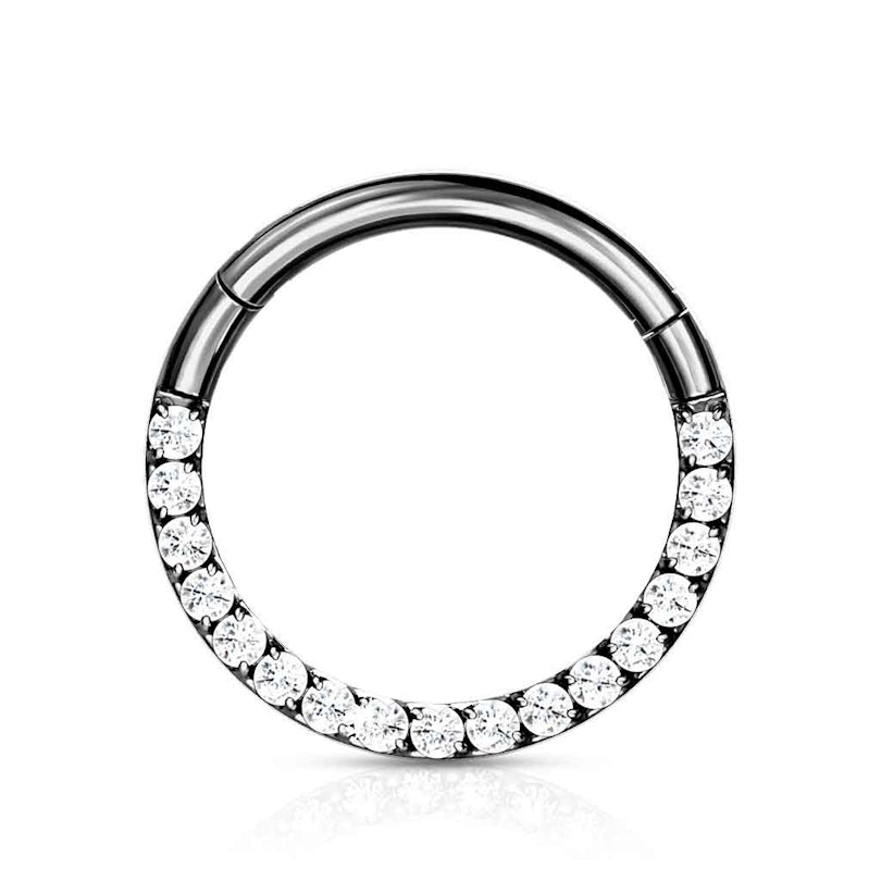 The front part of the ring has a row of sparkling stones. You should consider the location of the stones, depending on which piercing you want the ring for. For example, the stones are ideally located for septum or daith piercing, but for nostril, you may prefer a design that has stones facing outwards.