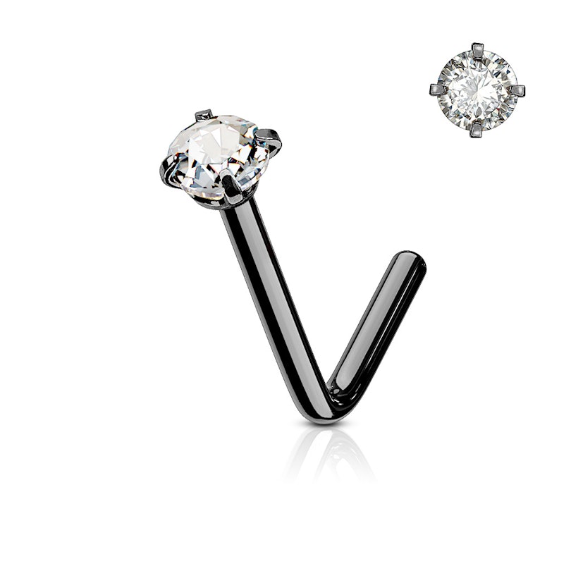 The stud is L-shaped, allowing a secure fitment without the risk of slipping out. The size of the bar is the same in all the models: a gauge of 20g (0.8 mm) and a length of 1/4" (6 mm). The size of the zirconia stone is about 1/8" (between 2.5 and 3 mm depending on the design). Lastly, it's worth mentioning that all of them are made of surgical steel.