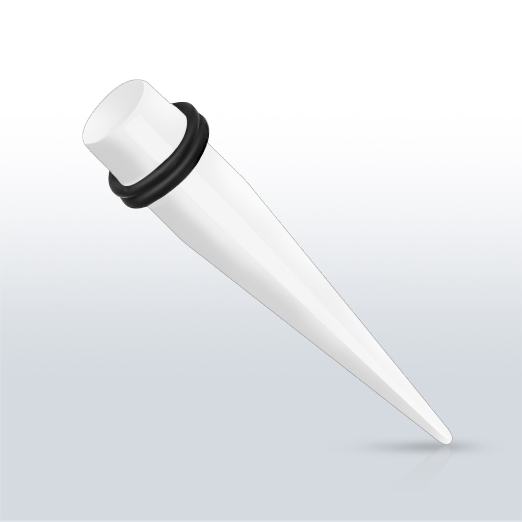 This model is made of acrylic. Note that in the picture, there are different models in solid and semi-transparent colors. Pick the color and the gauge size you desire. The diameter you select should be the one that you want to reach. That means that if you choose the taper of 0g (8 mm) in diameter, the widest end has that diameter.