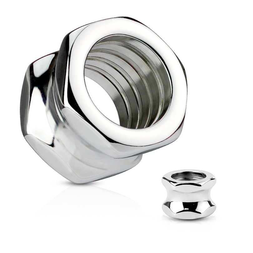 Hexa means 6, which is the number of sides a hexagon has, just like this hexagon nut. On the inside, you can see that it has a threaded hole, like a real threaded nut. It's available in six different sizes that range from 2g up to 5/8" (6 mm to 16 mm).
