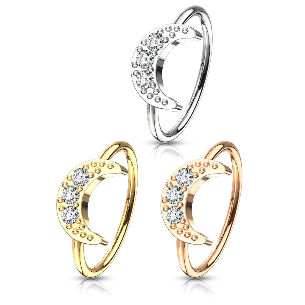 Surgical steel seamless ring featuring a crescent moon. The moon is decorated with three clear stones in the centre, surrounded by tiny stud details.