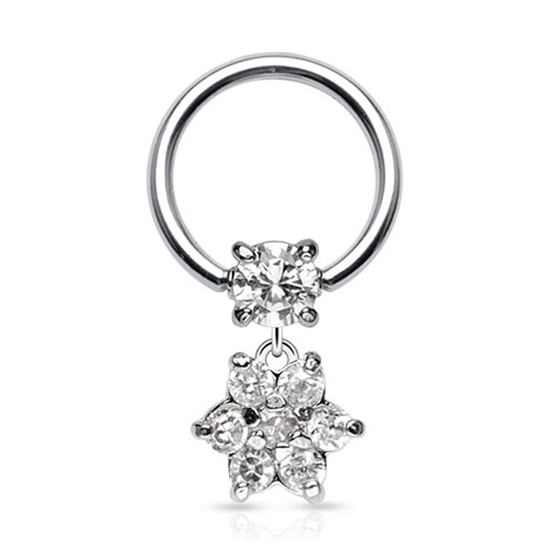 Very sweet captive bead ring with a beautiful flower dangle, perfect for you if you want a beautiful intimate piercing. This ring is made of surgical steel, and the flower has seven tiny gems with a diamond cutting.