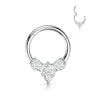 This solid surgical steel ring will deliver all the dazzle needed for your piercing. The jewelry has a durable PVD coating to achieve a selection of radiant colors that will last longer than standard coating. The ring also features a flashy stone design consisting of a big pear-shaped stone between two smaller round stones. These clear stones are forward-facing, making the ring perfect for septum piercing and certain ear piercings, like daith or tragus.