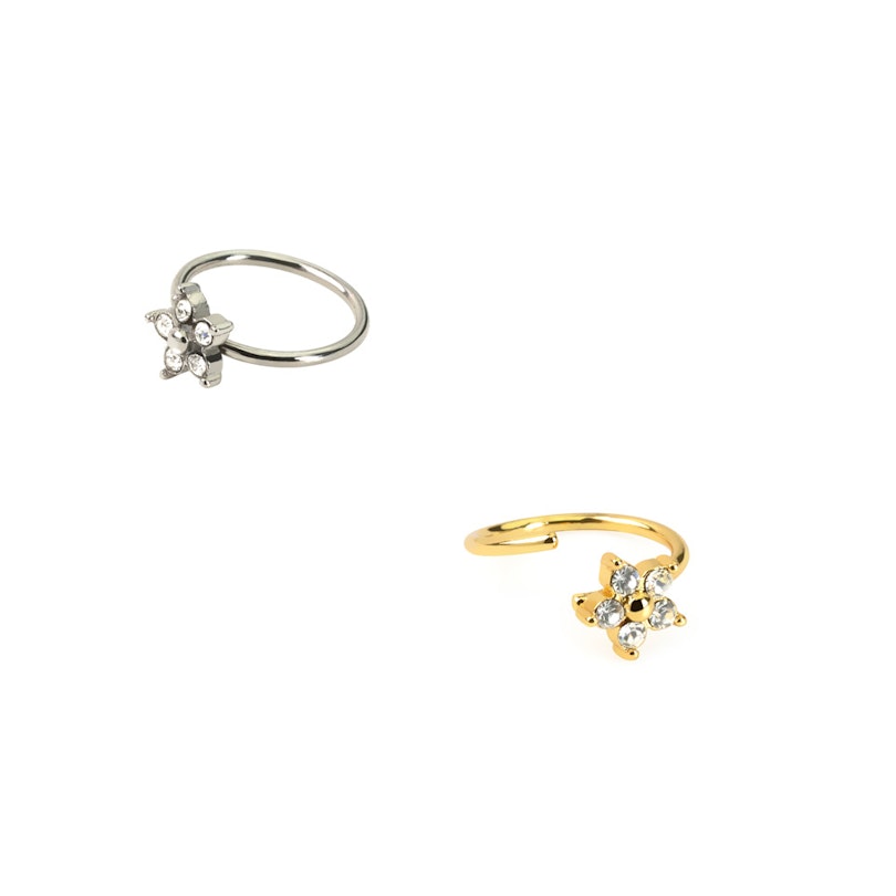 This dainty surgical steel ring features a dainty flower made up of five gemstone petals around a central bead. Available in a choice of gold or silver finishes, this piece is made from surgical steel so it is strong, durable and won't tarnish. With a thin thread (0.8 mm / 20g) this ring is ideal for nose piercings, but can also be worn in helix and other ear piercings. Simply twist to open, insert into your piercing and twist again to secure.