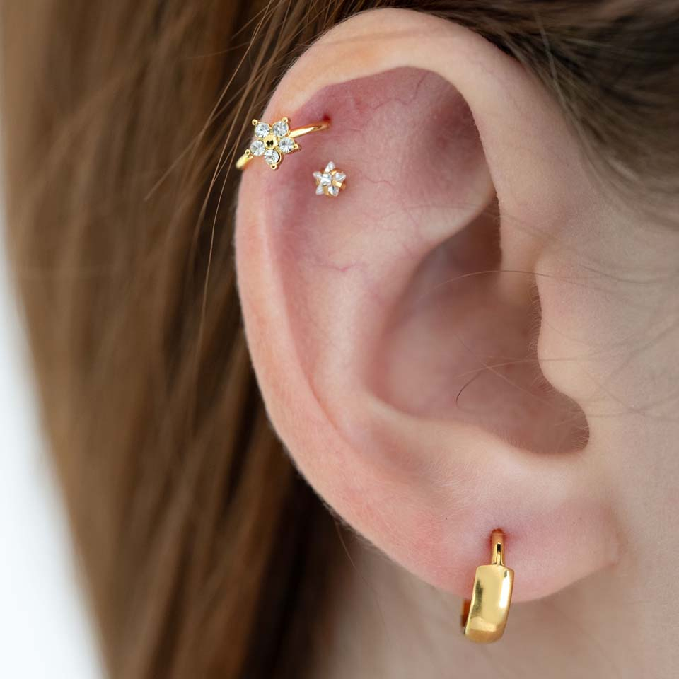 This dainty surgical steel ring features a dainty flower made up of five gemstone petals around a central bead. Available in a choice of gold or silver finishes, this piece is made from surgical steel so it is strong, durable and won't tarnish. With a thin thread (0.8 mm / 20g) this ring is ideal for nose piercings, but can also be worn in helix and other ear piercings. Simply twist to open, insert into your piercing and twist again to secure.