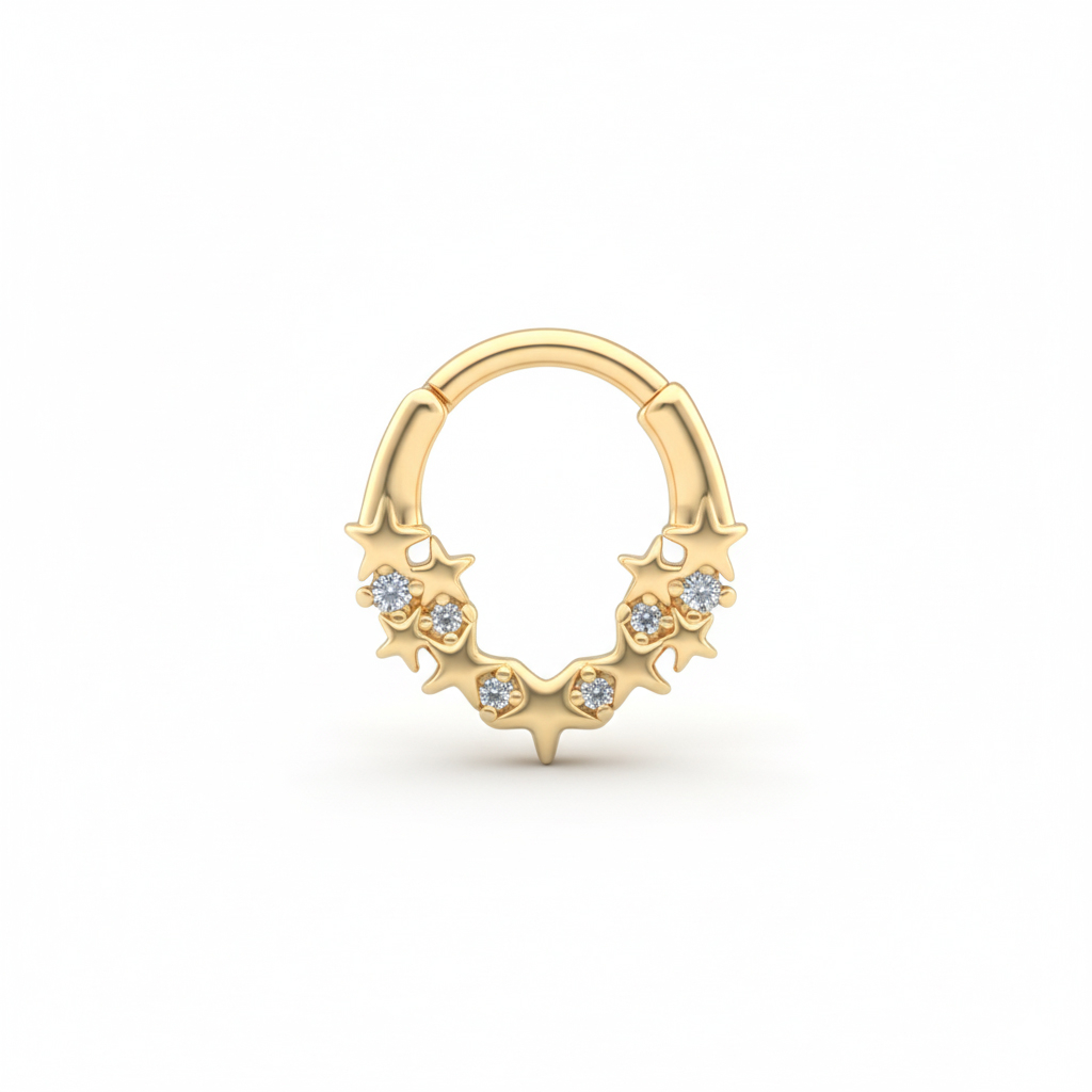 Žiedinis auskaras su priekyje esančiomis žvaigždutėmis ir akmenukais