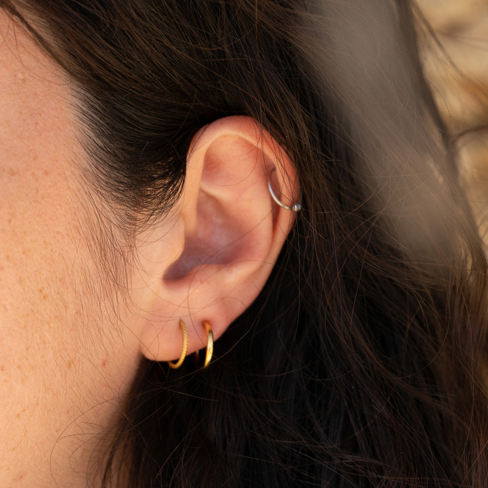 Kyla klausimų, kaip įsisegti auskarą? Labai paprastai - patrauk žiedo galus į šonus, kad susiformuotų spiralė. Po to įkišk žiedą į pradurtą skylutę, prispausk galus atgal.