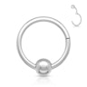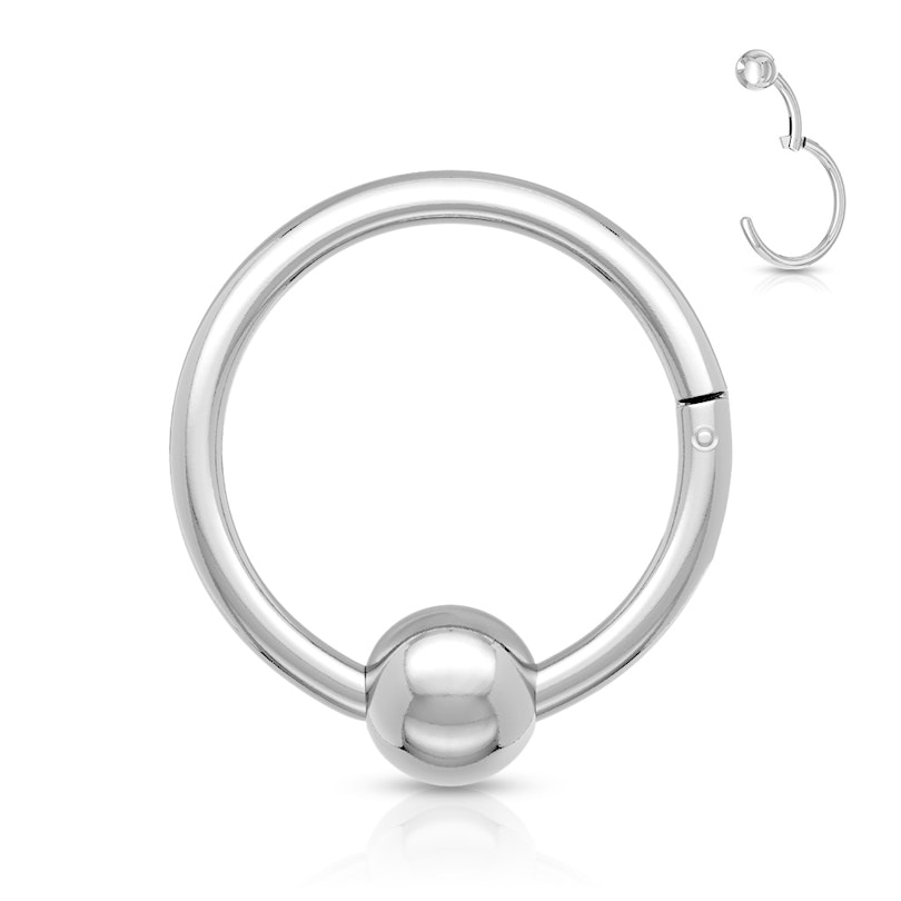 In regular captive bead rings (CBR) or ball closure rings (BCR), it is the ball that is removed and inserted to open and close the ring. However, this is not the case here. In this piece, the ball is part of the ring. The ball is attached to a hinged bar attached to the rest of the ring. This method allows you to open the ring easily with a simple click. And to close it, you only need to push the hinge back in - the end of the ring will snap into a small recess.