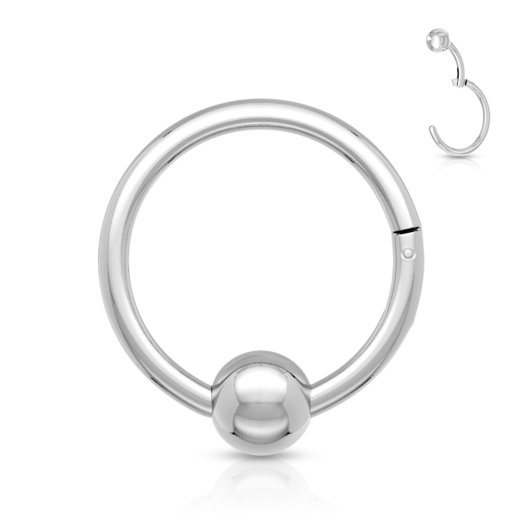 In regular captive bead rings (CBR) or ball closure rings (BCR), it is the ball that is removed and inserted to open and close the ring. However, this is not the case here. In this piece, the ball is part of the ring. The ball is attached to a hinged bar attached to the rest of the ring. This method allows you to open the ring easily with a simple click. And to close it, you only need to push the hinge back in - the end of the ring will snap into a small recess.