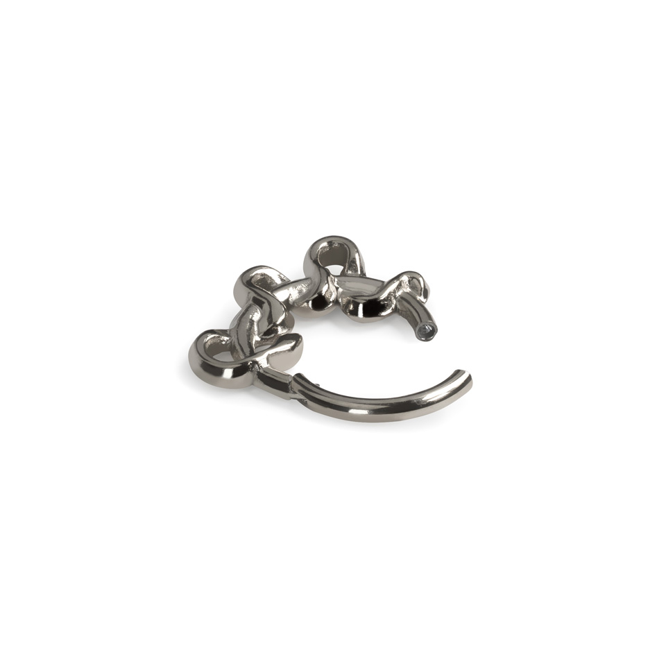 Šis žiedinis auskaras su vyrių užsegimu ir gyvatėlės papuošimu atrodo fantastiškai įvairiose auskaro vėrimo vietose, tarp jų septum, vidinio kaušelio, daith ir rook. Pagamintas iš chirurginio plieno, tad atsparus vandeniui ir tinka daugeliui odos tipų. Dėl vyrių užsegimo lengva įverti ir užsegti.