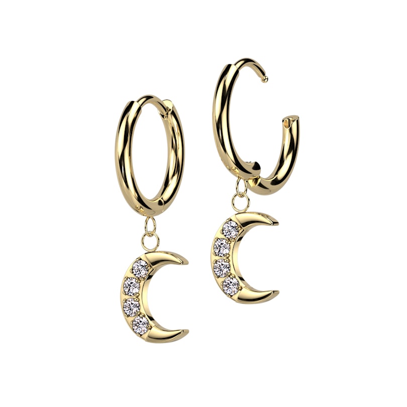 Ši žiedų su mėnulio formos pakabukais pora suteikia švelnų, dekoratyvų akcentą jūsų kasdieniam stiliui. Abu žiedai turi po mažą mėnulio pakabuką su akutėmis, tvarkingai įstatytomis laikikliuose, tad auskarai traukia akį, bet neatrodo perkrautai. Dėl vyrių užsegimo juos lengva įsikišti ir išsiimti. Galima įsigyti aukso ir sidabro spalvų.
